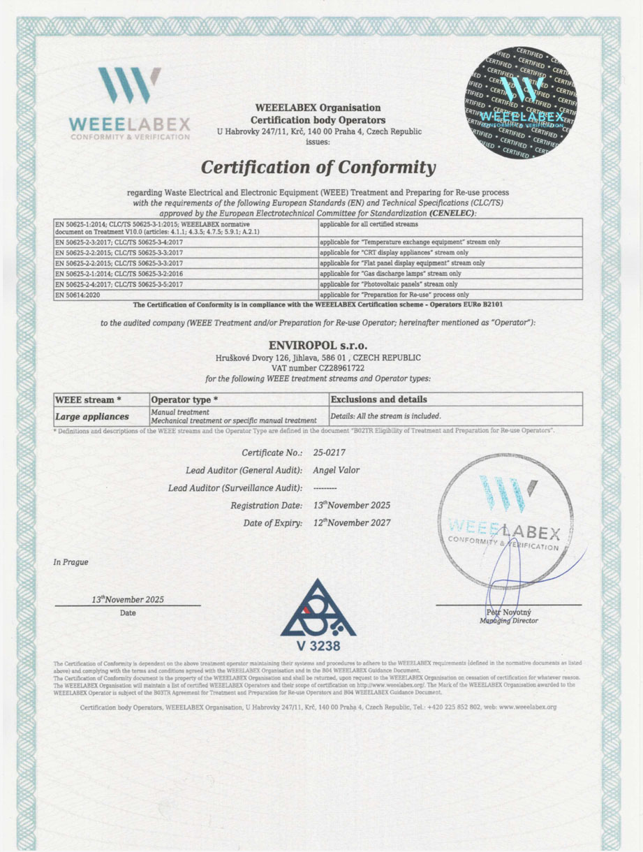 ENVIROPOL je držitelem mezinárodně uznávané certifikace WEEELABEX, která dokládá zákonné nakládání s nebezpečnými látkami a zároveň efektivní recyklací elektroodpadu.